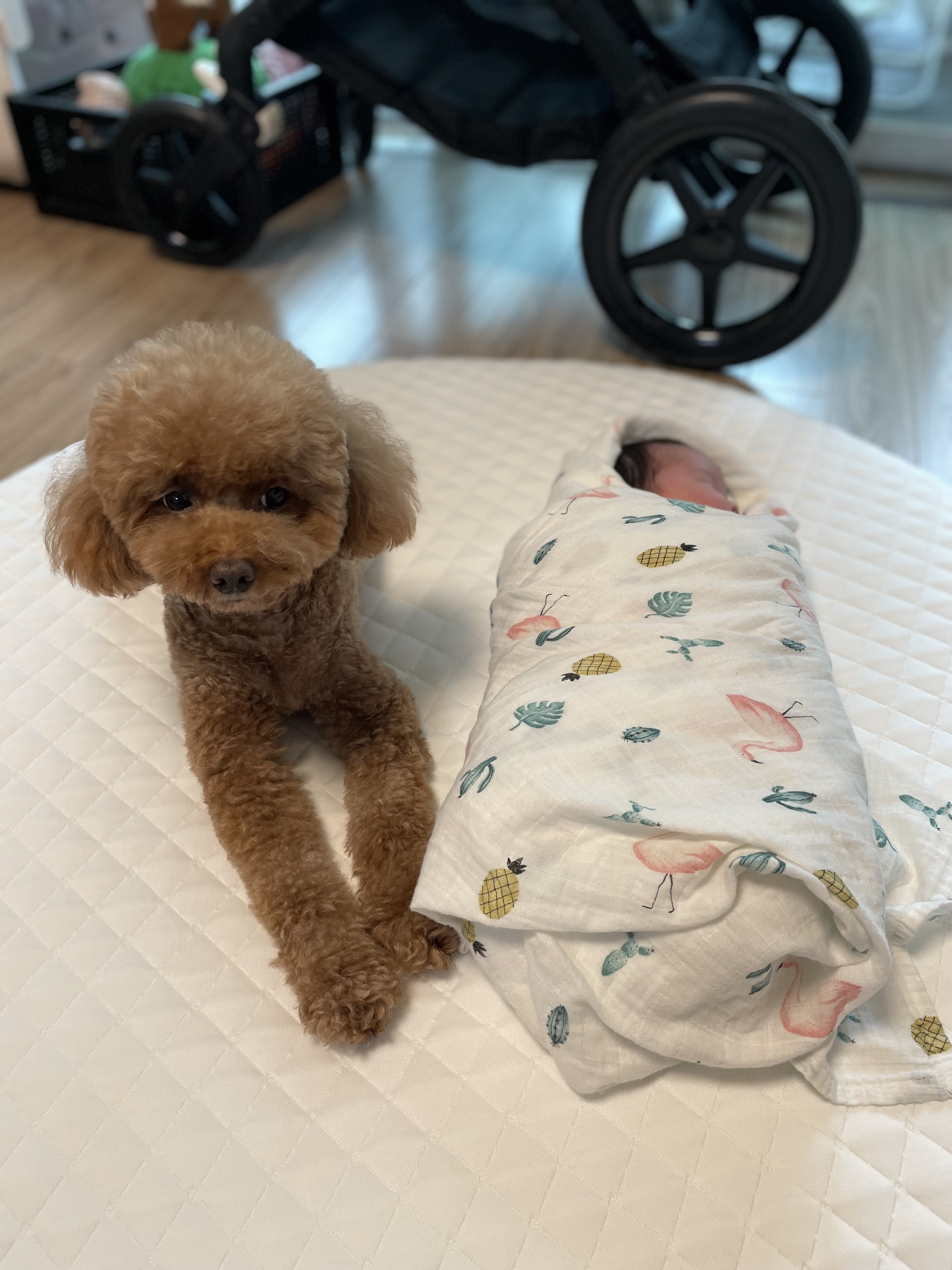 우리 집엔 2017년생 강아지 순자와 2023년생 아기가 함께 삽니다.